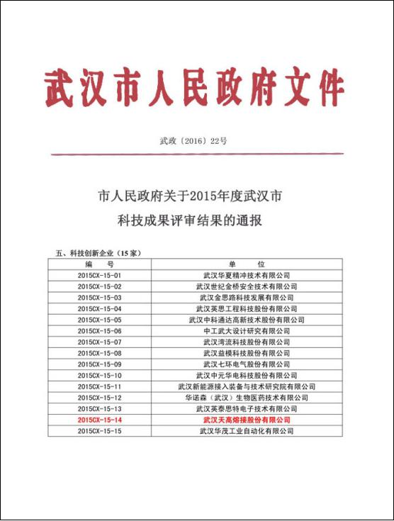 近日,根据《市人民政府关于2015年度武汉市科技成果评审结果的通报》文件,为进一步调动广大科技者的积极性,经有关单位组织推荐、专家评审、市科学技术奖励委员会综合评定,对天高股份等15家2015年度武汉市科技创新企业予以通报。近年来,面对日新月异的焊接新技术,天高股份始终以推动科技创新为宗旨,系统提升科技创新能力,以创新引领人才队伍建设,以人才促进企业持续发展。通过持续的创新活动,天高股份的业务领域